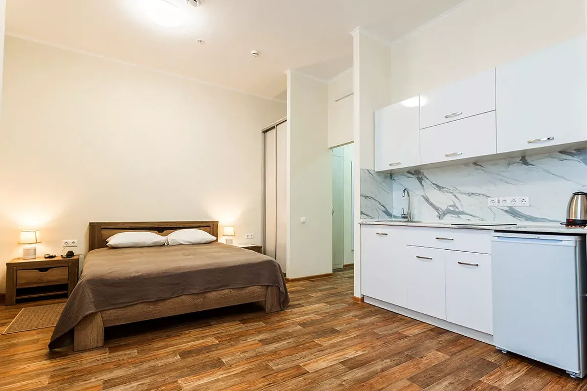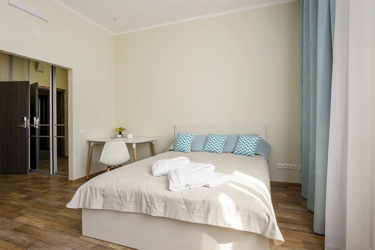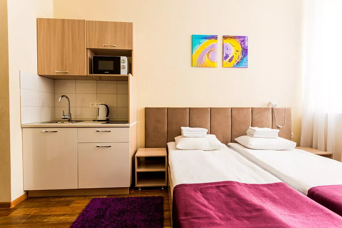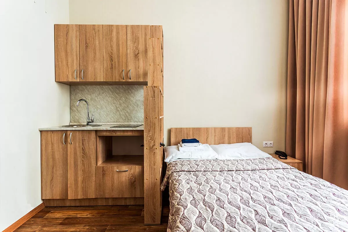 Для тех, кто любит все и сразу. Комфортные номера, оснащенные дополнительными удобствами, совсем как в квартире. Ресторан, магазин и салоны прямо в здании. Удобная транспортная развязка позволит добраться до любой точки города. Для путешественников на авто — бесплатная парковка.
