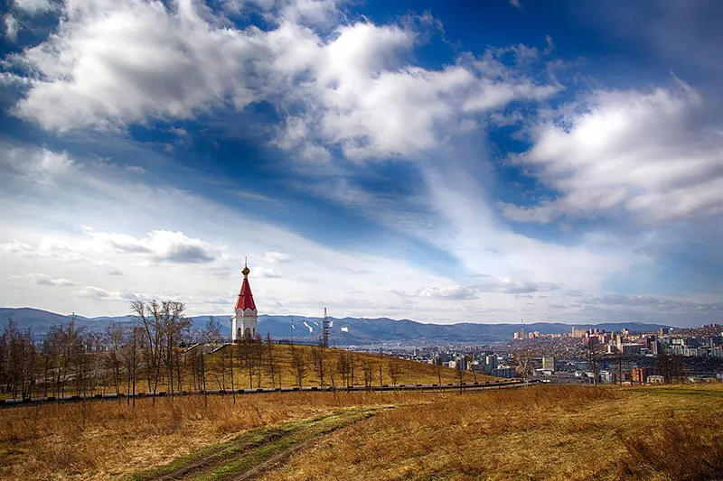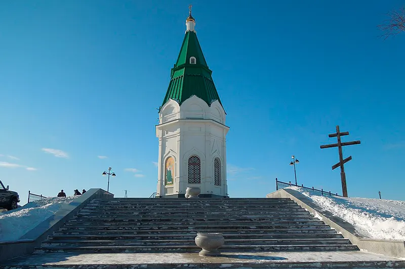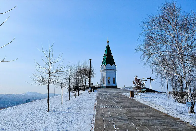 Православная часовня, один из символов города Красноярска. Располагается на вершине Караульной горы, на месте древнего языческого капища татар-качинцев.