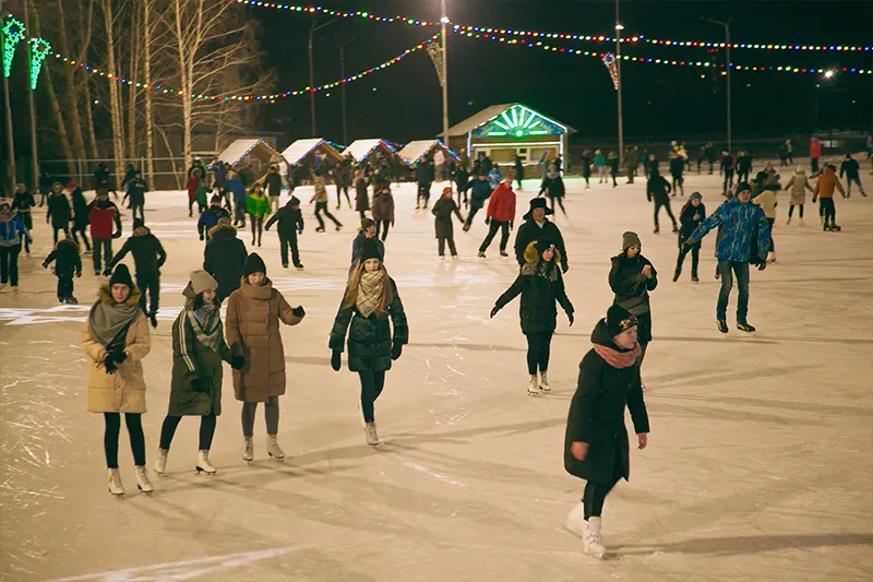 Зимой в парке заливается самая большая ледовая площадка в городе «Татышев-ICE», сверкает самая большая 55-метровая новогодняя ёлка России, открывается ледяной городок и лыжная трасса.